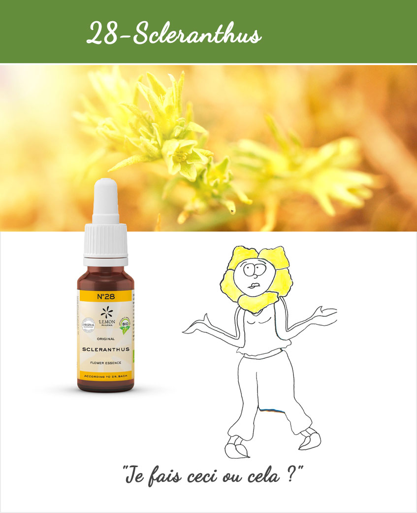 J’hésite Indécision, instabilité émotionnelle, déséquilibre. Alternance d’humeur. Alternance de symptômes (diarrhée / constipation). Balance entre indécision et résolution: ambivalence par rapport à un choix. Hésitation qui paralyse la volonté et empêche d’agir. Potentiel Positif: Capacité à prendre des décisions rapidement et à prendre de la distance pour avoir une approche globale des choses et non pas comme si elle s’opposaient les unes aux autres. Clarté d’esprit, équilibre, stabilité, détermination par rapport à ses choix. Cette thérapie florale naturelle a été élaborée par le Dr. Bach au début du siècle passé. Il sélectionne alors 38 fleurs qui nous permettent d’agir sur les émotions spécifiques que nous rencontrons dans notre quotidien et qui peuvent potentiellement nous perturber et ainsi nous empêcher d’aller de l’avant. Cela peut être lié à des chocs, des peurs, un manque de confiance en soi, un manque d’intérêt pour le moment présent, des déceptions ou chagrins, du stress… Nous avons tous des histoires de vie différentes, des schémas de fonctionnement, des croyances limitantes, etc…Parfois cela devient nocif pour nous-mêmes et notre entourage et influe donc sur notre santé et notre bien-être. Consultation Lieu : Nyon/ via Zoom Mon rôle est de découvrir, en collaboration avec mes patients, quelles sont les causes de leur mal être, mais aussi d’identifier les conséquences de ce mal-être, afin de se poser les bonnes questions.. En préventif 3 à 4 gouttes Garder sous la langue 30 secondes avant d’avaler. Brandy* (27% Vol.), eau, essence original de Fleurs de Bach Scleranthus* Nos produits peuvent être associés à tout autre traitement thérapeutique. Les fleurs de Bach se conservent 4 ans à température ambiante. * certifié Bio Les fleurs de Bach sont produites selon les préceptes du Dr. Bach en Angleterre. Culture biologique certifiée. Avec Marianne Deville