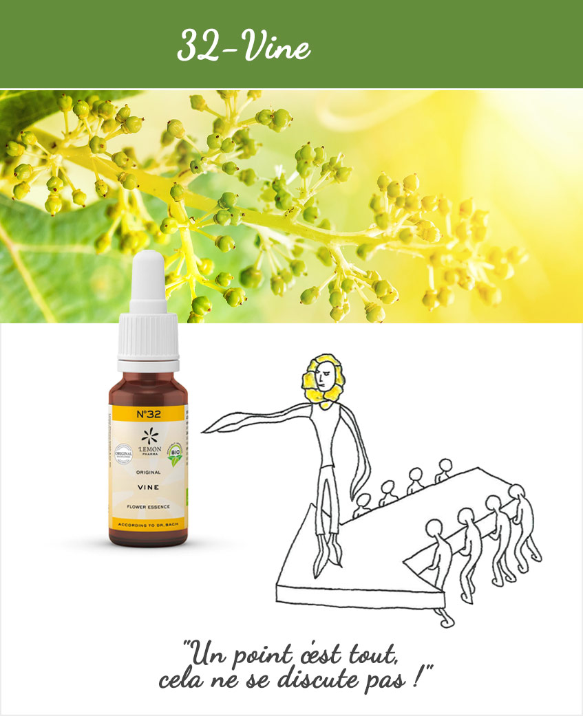 Leader né Il dicte, impose: veut avoir toujours raison. Autoritaire et abuse, veut dominer: personnes aux opinions bien arrêtées qui pensent avoir toujours raison. On utilise sa colère comme moyen de pression pour obtenir ce que l’on veut. Manque de sensibilité qui rend parfois capable de cruauté. Sentiment exacerbé de supériorité par rapport aux autres. Potentiel Positif: Autorité naturelle qui peut s’exprimer avec douceur. Capacité à briser un schéma familial de domination et de contrôle. Générosité et empathie envers les autres. Cette thérapie florale naturelle a été élaborée par le Dr. Bach au début du siècle passé. Il sélectionne alors 38 fleurs qui nous permettent d’agir sur les émotions spécifiques que nous rencontrons dans notre quotidien et qui peuvent potentiellement nous perturber et ainsi nous empêcher d’aller de l’avant. Cela peut être lié à des chocs, des peurs, un manque de confiance en soi, un manque d’intérêt pour le moment présent, des déceptions ou chagrins, du stress… Nous avons tous des histoires de vie différentes, des schémas de fonctionnement, des croyances limitantes, etc…Parfois cela devient nocif pour nous-mêmes et notre entourage et influe donc sur notre santé et notre bien-être. Consultation Lieu : Nyon/ via Zoom Mon rôle est de découvrir, en collaboration avec mes patients, quelles sont les causes de leur mal être, mais aussi d’identifier les conséquences de ce mal-être, afin de se poser les bonnes questions.. En préventif 3 à 4 gouttes Garder sous la langue 30 secondes avant d’avaler. Brandy* (27% Vol.), eau, essence original de Fleurs de Bach Vine* Nos produits peuvent être associés à tout autre traitement thérapeutique. Les fleurs de Bach se conservent 4 ans à température ambiante. * certifié Bio Les fleurs de Bach sont produites selon les préceptes du Dr. Bach en Angleterre. Culture biologique certifiée. Avec Marianne Deville