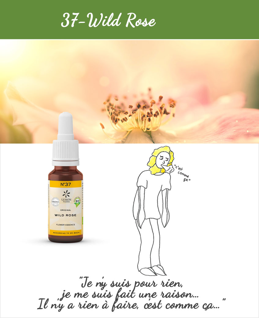 Bof attitude Abattu, reste statique, n’avance pas: c’est la «Bof attitude… » Manque de motivation. Malades, ils se résignent. Fatalisme: acceptent la vie comme elle se présente sans se poser de questions ou se plaindre. Aphathie: reste des heures sans rien faire ou bouger. Perte de toute joie de vivre et d’envie de réagir. Potentiel Positif: Capacité à prendre des initiatives et de la motivation. On devient plus déterminé: on s’accroche jusqu’à ce que le problème soit résolu. Aide à retrouver enthousiasme et dynamisme: on repart, on retrouve la joie de vivre et on dit «OUI» à la vie. Cette thérapie florale naturelle a été élaborée par le Dr. Bach au début du siècle passé. Il sélectionne alors 38 fleurs qui nous permettent d’agir sur les émotions spécifiques que nous rencontrons dans notre quotidien et qui peuvent potentiellement nous perturber et ainsi nous empêcher d’aller de l’avant. Cela peut être lié à des chocs, des peurs, un manque de confiance en soi, un manque d’intérêt pour le moment présent, des déceptions ou chagrins, du stress… Nous avons tous des histoires de vie différentes, des schémas de fonctionnement, des croyances limitantes, etc…Parfois cela devient nocif pour nous-mêmes et notre entourage et influe donc sur notre santé et notre bien-être. Consultation Lieu : Nyon/ via Zoom Mon rôle est de découvrir, en collaboration avec mes patients, quelles sont les causes de leur mal être, mais aussi d’identifier les conséquences de ce mal-être, afin de se poser les bonnes questions.. En préventif 3 à 4 gouttes Garder sous la langue 30 secondes avant d’avaler. Brandy* (27% Vol.), eau, essence original de Fleurs de Bach Wild rose* Nos produits peuvent être associés à tout autre traitement thérapeutique. Les fleurs de Bach se conservent 4 ans à température ambiante. * certifié Bio Les fleurs de Bach sont produites selon les préceptes du Dr. Bach en Angleterre. Culture biologique certifiée. Avec Marianne Deville
