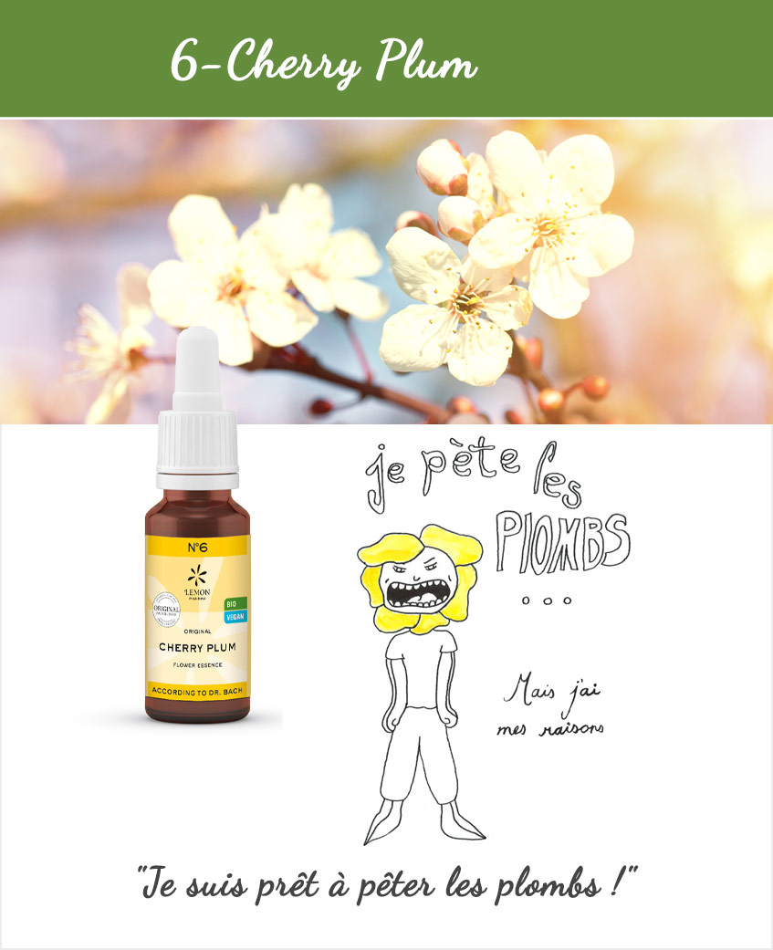 Je pête les plombs! Peur de perdre le contrôle de soi et de faire du mal à autrui: peur de basculer dans la folie, de commettre un acte irréparable, crises de violences incontrôlables, «on pète les plombs»… Envie de faire, ou de se faire du mal, on croit que l’on va devenir fou! Potentiel Positif: Pour retrouver la paix, le calme, la force mentale, et la clarté. Capacité à retrouver le contrôle de soi: on garde son sang-froid dans toutes les situations. Cette thérapie florale naturelle a été élaborée par le Dr. Bach au début du siècle passé. Il sélectionne alors 38 fleurs qui nous permettent d’agir sur les émotions spécifiques que nous rencontrons dans notre quotidien et qui peuvent potentiellement nous perturber et ainsi nous empêcher d’aller de l’avant. Cela peut être lié à des chocs, des peurs, un manque de confiance en soi, un manque d’intérêt pour le moment présent, des déceptions ou chagrins, du stress… Nous avons tous des histoires de vie différentes, des schémas de fonctionnement, des croyances limitantes, etc…Parfois cela devient nocif pour nous-mêmes et notre entourage et influe donc sur notre santé et notre bien-être. Consultation Lieu : Nyon/ via Zoom Mon rôle est de découvrir, en collaboration avec mes patients, quelles sont les causes de leur mal être, mais aussi d’identifier les conséquences de ce mal-être, afin de se poser les bonnes questions.. En préventif 3 à 4 gouttes Garder sous la langue 30 secondes avant d’avaler. Brandy* (27% Vol.), eau, essence original de Fleurs de Bach Cherry plum* Nos produits peuvent être associés à tout autre traitement thérapeutique. Les fleurs de Bach se conservent 4 ans à température ambiante. * certifié Bio Les fleurs de Bach sont produites selon les préceptes du Dr. Bach en Angleterre. Culture biologique certifiée. Avec Marianne Deville