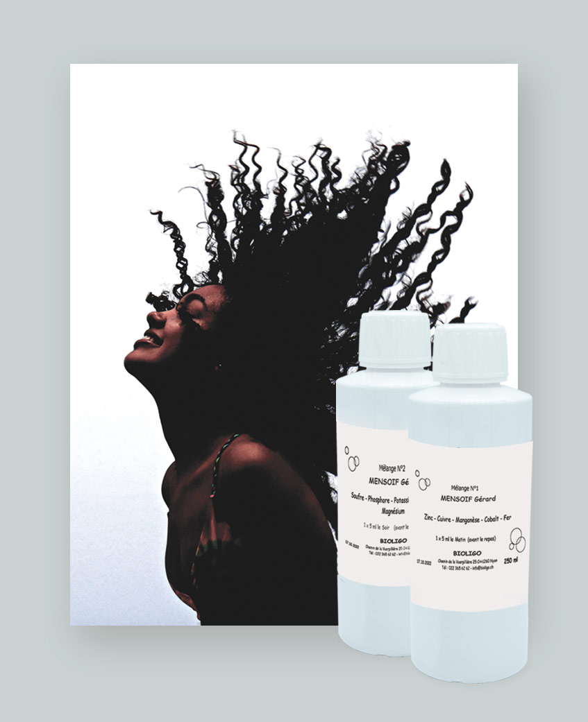 Un bilan minéral de votre organisme avec L’analyse du cheveu est intéressante par rapport à l’analyse de sang, car le sang est un transporteur qui se charge et se décharge au gré des besoins de l’organisme. Il transporte les éléments et les valeurs peuvent varier du matin au soir, alors que le cheveu n’est pas sujet à ces variations fugaces. Pour procéder à l’analyse, le cheveu est prélevé, pesé, nettoyé, séché puis à nouveau pesé. Chaque échantillon est ensuite trempé dans une solution acide afin de le rendre liquide et analysable dans sa composition minérale. La plupart des patients nous mandatent pour connaitre leurs carences; en réalité, les excès sont tout aussi fréquents que les carences (dans près de 80% des cas). Notre nourriture est la plupart du temps riche et variée, assurant ainsi des apports quantitatifs suffisants, mais qualitativement faibles. Ceci peut générer un encrassement aussi nocif pour le fonctionnement de l’organisme que le sont les carences. Un excès de calcium chez un jeune homme de 28 ans n’est pas comparable à celui d’une femme de 50/60 ans, ne serait-ce que parce qu’à cet âge, il y a de toute façon une perte (le calcium est moins bien fixé à cause d’une diminution de la sécrétion de calcitonine). On le retrouve en plus grande quantité dans les liquides circulants et donc, le cheveu va en puiser plus. Il est donc fréquent de trouver un excès de calcium dans les cheveux des femmes pré-ménopausées ou ménopausées et nous en tenons compte dans notre interprétation. C’est pour cela qu’il est primordial de remplir avec précision le questionnaire. Argent, Baryum, Calcium, Chrome, Cobalt, Cuivre, Fer, Germanium, Lithium, Magnésium, Manganèse, Molybdène, Nickel, Or, Phosphore, Platine, Potassium, Sélénium, Silicium, Strontium, Sodium, Soufre, Vanadium, Zinc. Aluminium, Arsenic, Béryllium, Cadmium, Étain, Mercure et Plomb. sur mesure selon vos résultats d’analyse. Suite à l’analyse, nous formulons des préparations spécialement pour vous, donc sur mesure. Selon le principe des antagonismes et des synergies, nous allons sélectionner les éléments carencés mais surtout ceux qui favorisent leur assimilation et pour tous les éléments en excès, leurs antagonistes. Nous sélectionnons le cuivre, acteur principal du processus d’assimilation du fer (catalyse la ferritine et la transferrine), mais également le cobalt, l’iode, le manganèse et le molybdène, co-facteurs indispensables à ce processus. En cas de valeur élevée en plomb, nous sélectionnons ses antagonistes: le calcium, le molybdène et le soufre pour autant qu’ils ne soient pas déjà en excès. Comment procéder ? Commandez votre kit à l’aide du formulaire ci-dessous. Complétez votre questionnaire. Toutes vos informations sont utiles à notre interprétation. Elles resteront bien évidemment confidentielles. Couper les cheveux au niveau de la nuque, le plus près possible du cuir chevelu. Ne garder que les 2-3 premiers centimètres. 3 à 5g de cheveux sont nécessaires ou l’équivalent d’une cuillère à soupe. Votre kit contient le questionnaire à remplir, l’enveloppe pour votre échantillon de cheveux et une enveloppe pré-affranchie pour nous renvoyer le tout. Évitez le papier d’aluminium pour emballer vos cheveux. Vous désirez recevoir votre cure en même temps que vos résultats et ainsi bénéficier d’un rabais de CHF 30.- sur votre analyse ? Indiquez-le sur votre questionnaire. En achetant votre analyse, vous recevez automatiquement votre kit de prélèvement Le kit contient : Vous recevrez de 1 à 3 mélanges en fonction de vos résultats Adultes : 5 ml Adultes: 50 jours Notre conseil Il est recommandé de faire minimum 2 cures pour rééquilibrer votre organisme. Vous pouvez renouveler votre cure à votre convenance pendant 2 ans avant de refaire une analyse. Nos produits peuvent être associés à tout autre traitement thérapeutique. Nos produits sont naturels et fabriqués en Suisse dans notre Laboratoire à Nyon