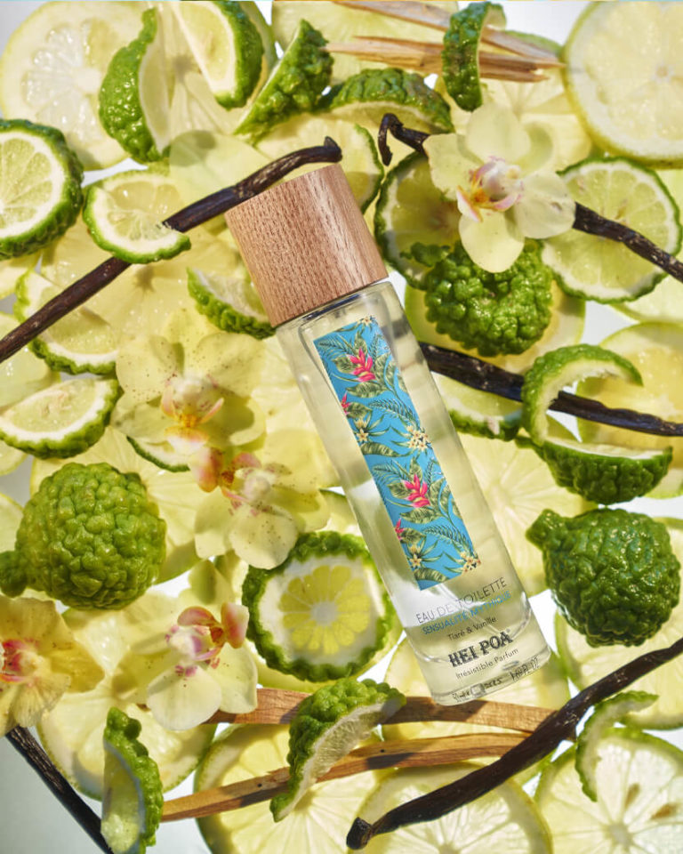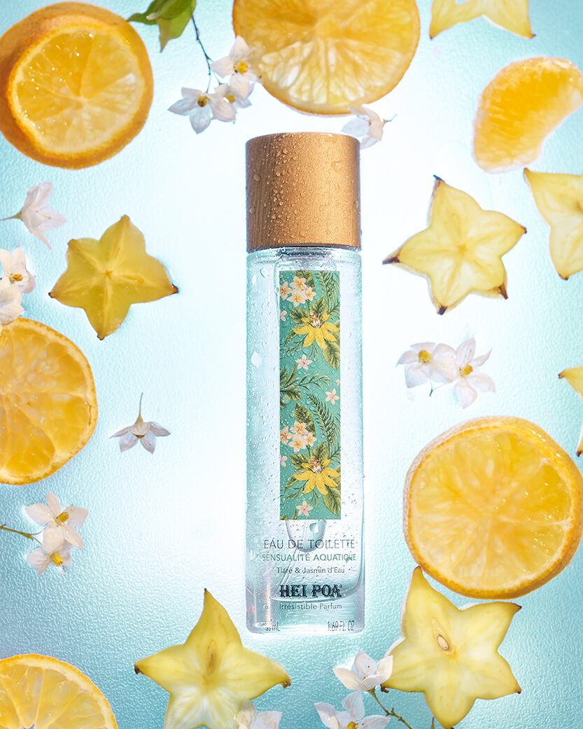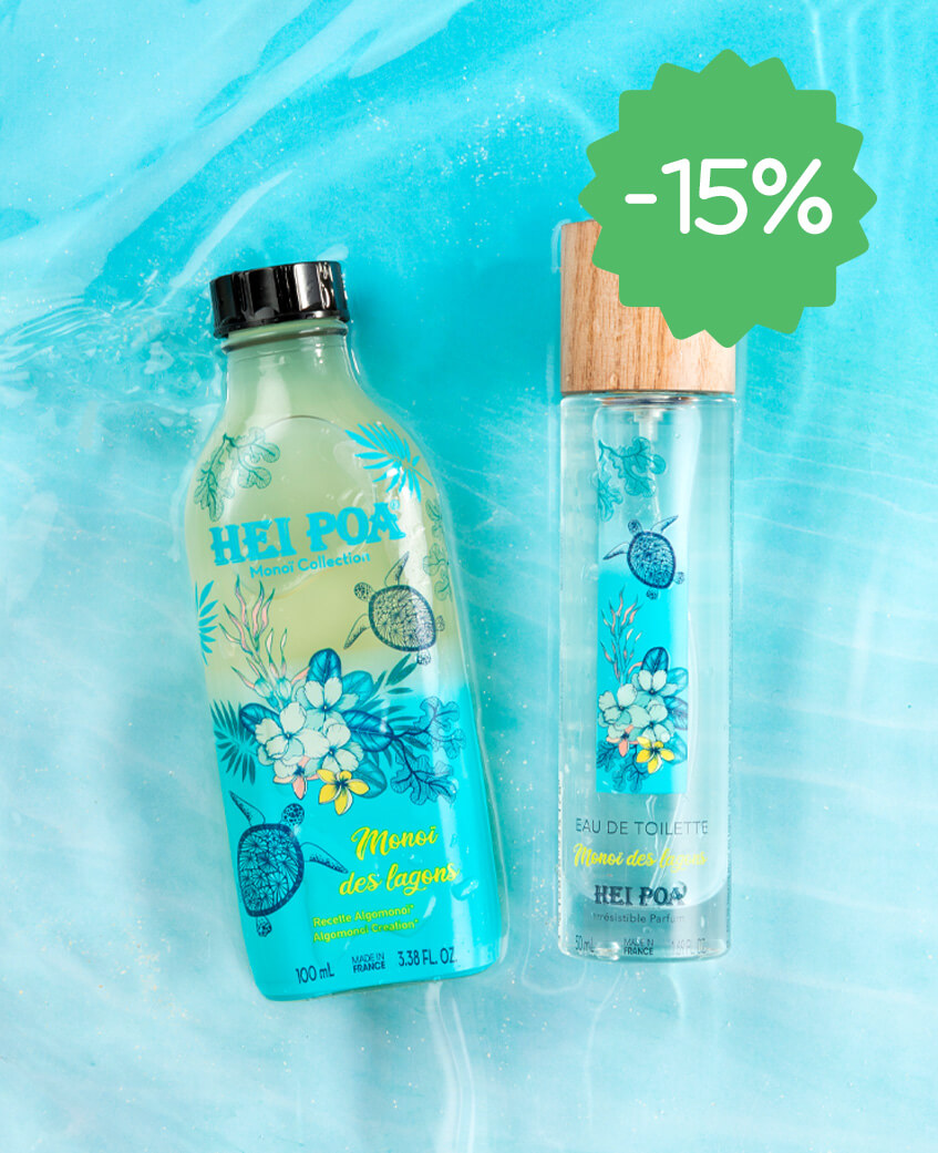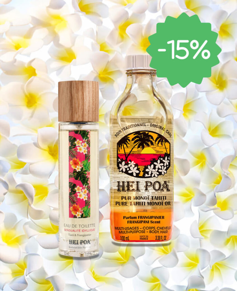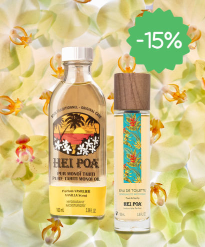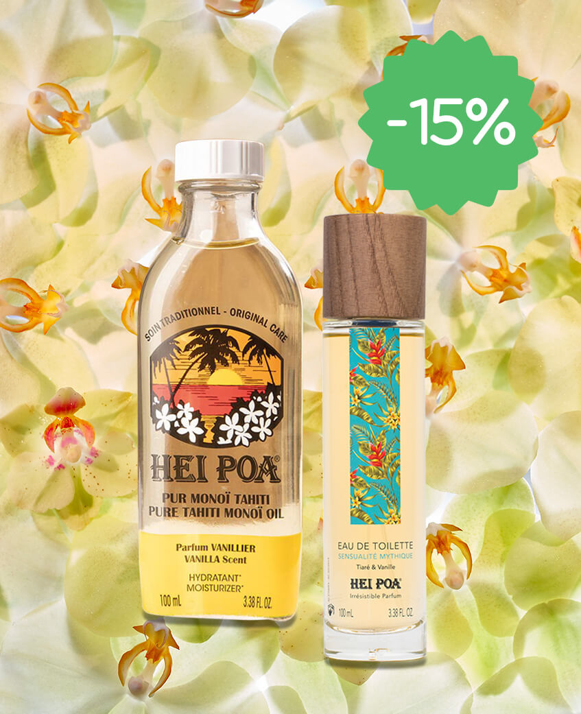 Frangipanier, freesia, bois blanc, citron et tiaré, un sillage de vanille et de musc. Le soin apaisant adapté aux peaux sensibles, aux coups de solei. Vanille-tiaré, marié à l’iris, au jasmin et à l’oranger associé aux agrumes, au patchouli et santal. Un soin relaxant au parfum envoûtant mêlant la vanille au monoï. Un coeur de bergamote, souligné par un sillage d’embruns et de sable chaud. Une macération de l’algue Turinaria Ornata et de monoï. Un coeur de lotus blanc, magnolia et tiaré associé au melon d’eau, cédrat et pitaya, avec un sillage de vanille-musc. Un coeur Frangipanier-Fleur d’oranger, marié à la mandarine, mangue et jasmin d’eau, avec un sillage de musc et fruits d’eau. Utilisation Pour un parfum longue durée, quelques gouttes derrière l’oreille ou au creux du poignet suffisent. Voyage Hei poa réunit pour vous toutes les senteurs idylliques des îles polynésiennes. Fragrances À choix, 4 fragrances pour agrémenter vos envies tout au long de l’année. Fraîcheur Des parfums suaves et rafraîchissant pour se sentir en vacances toute l’année. Usage externe. Conserver hors de la portée des enfants. Ne pas vaporiser dans les yeux. Inflammable. Ne pas utiliser près d’une flamme. Conserver à l’abri de la chaleur et la lumière. HeiPoa propose avec ses eaux de toilette, une évasion sous les tropiques avec des combinaisons sensuelles autour du tiaré. HeiPoa privilégie les packaging éco-responsable et a choisi, pour sa gamme de parfums des flacons en verre agrémentés de bouchons en bois. HeiPoa se fournit principalement en Polynésie française et privilégie la fabrication locale.