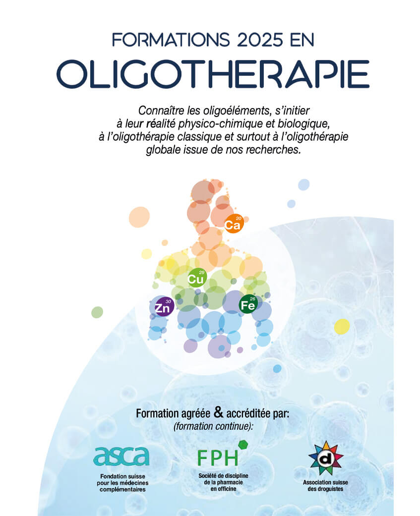 Les oligoéléments, présents en quantité infinitésimale dans notre organisme, sont pourtant essentiels à son équilibre. Ce sont les catalyseurs, les moteurs de toutes nos fonctions: digestion, immunité, système nerveux, cardio-vasculaire, etc. Connaître le vrai problème des oligoéléments, s’initier à leur réalité physico-chimique et biologique, à l’oligothérapie classique et surtout à la nouvelle oligothérapie globale issue de nos recherches Frédéric Deville Formation La formation complète comporte 3 modules de 8h. Lieu & Horaire Laboratoires Bioligo SA 9h à 12h30 et 13h30 à 18h Repas de midi Nous vous proposons de manger au restaurant avec votre formateur (boissons offertes) ou d’utiliser notre salle de repos (micro-ondes et vaisselle à disposition). Tarifs Un cours = 50 points Pack de 3 cours = 12 étoiles Pratique du questionnaire d’anamnèse, posologie et priorités thérapeutiques. Études de cas amenés par les participants, minimum 3 cas par personne. Où nous trouver ? Nos ArticlesLa santé vient de l’intérieur