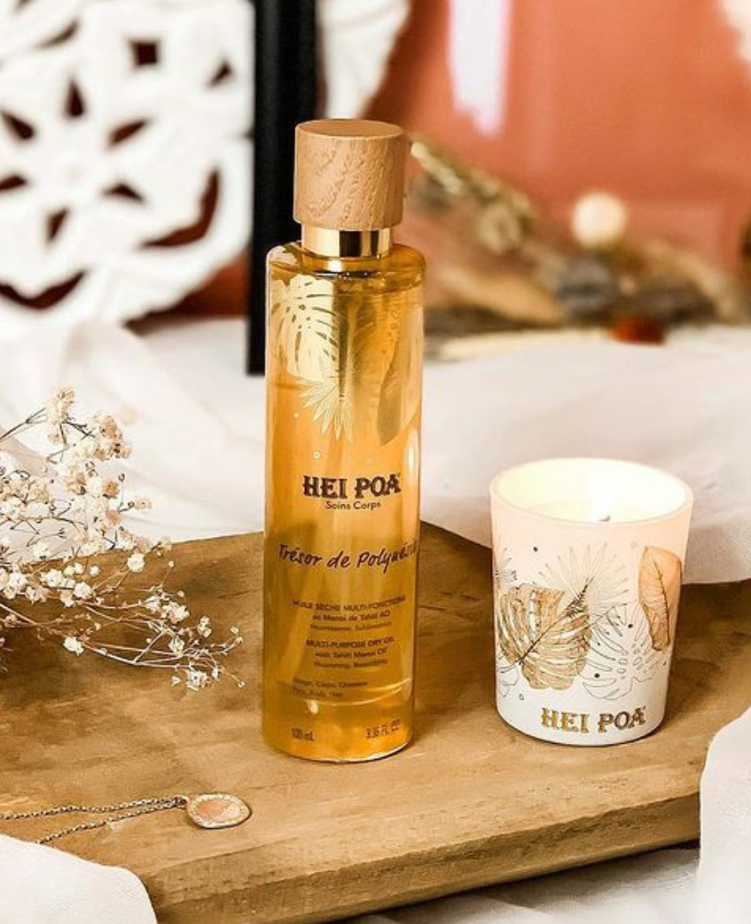 Composée à partir d’huiles végétales riches en acides gras, on y adjoint des agents émollients issus de noix de coco pour atténuer l’effet gras et permettre une pénétration immédiate et sans film gras. Monoï Fleur de tiaré Appliquez le matin avant votre crème de jour pour protéger votre peau. Vous pouvez ajouter quelques gouttes à votre soin de nuit ou/et à votre masque pour une action régénérante et pour en finir avec les tiraillements. Vaporisez sur les cheveux après le shampoing ou avant le coiffage pour faciliter le démêlage, hydrater et nourrir vos cheveux en profondeur. Elle protège vos mains des agressions (produits de ménage, désinfectant..) et permet de les réhydrater efficacement. Vous pouvez également masser vos cuticules après vos soins. Elle parfume agréablement votre peau tout en la nourrissant. Vous pouvez également mettre quelques gouttes dans votre bain pour un effet soyeux ou vous masser les pieds en fin de journée pour éviter les callosités. CAPRYLIC/CAPRIC TRIGLYCERIDE, COCO-CAPRYLATE/CAPRATE, COCOS NUCIFERA (COCONUT) OIL, PARFUM (FRAGRANCE), TOCOPHERYL ACETATE, GARDENIA TAITENSIS FLOWER EXTRACT, TOCOPHEROL, BENZYL SALICYLATE, LINALOOL, BENZYL ALCOHOL, BENZYL BENZOATE. Utilisation La peau et les cheveux sont nourris et exhalent un doux parfum de monoï. Avant d’applique votre huile sèche, utilisez le savon extra-doux ou le gel-douche. Leur base lavante végétale au PH neutre préservera votre peau. HeiPoa privilégie la production Polynésienne avec 96% d’ingrédients d’origine naturelle. HeiPoa privilégie les packaging éco-responsable et a choisi des emballages en plastique 50% recyclés et avec 13% de plastique en moins. Le monoï est un soin naturellement hydratant et régénérant pour tous les types de peaux. Un savoir ancestral Les noix de coco sont récoltées dans les cocoteraies verdoyantes de la Polynésie, elles sont sélectionnées et séchées au soleil. Les boutons de fleurs fraiches de Tiaré sont cueillis à l’aube et mis en macération dans l’huile de coco obtenue par pression, à raison de 10 fleurs par litre. Pendant quelques jours, les fleurs de Tiaré vont distiller leur arôme dans l’huile jusqu’à obtenir le véritable Monoï de Tahiti.