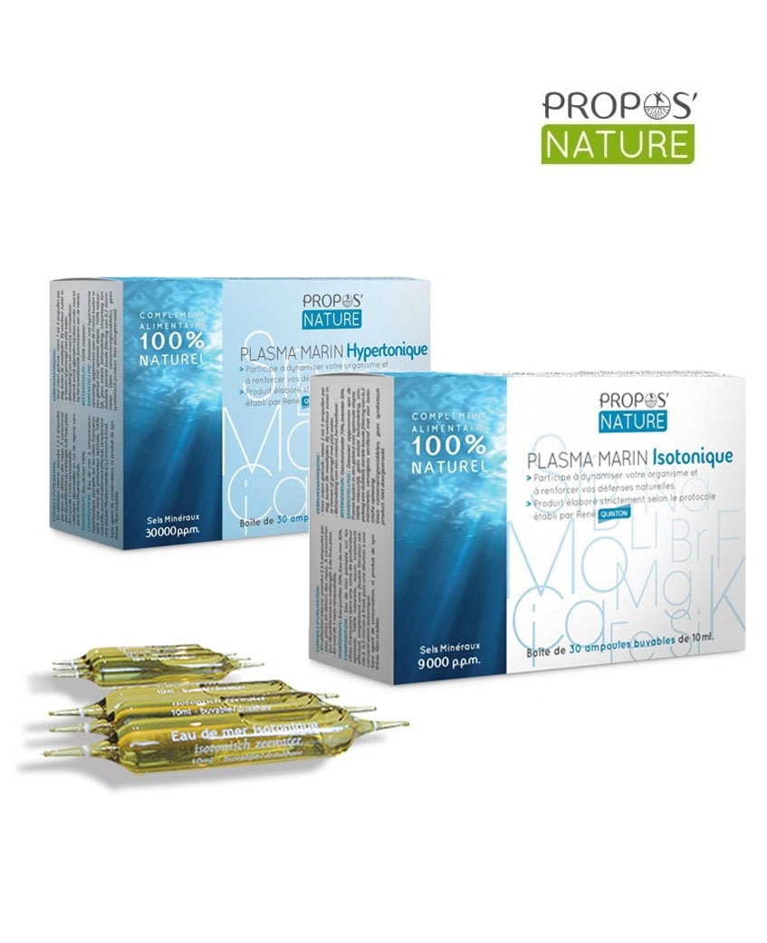 Récolté au large de l’Atlantique dans de strictes conditions de sécurité et d’hygiène, l’eau de mer est mise en ampoule sous 24h. La microfiltration se fait à très basse température pour préserver toutes les qualités et l’efficacité des constituants marin (oligoéléments et protéines du plancton) L’eau de mer est pompée en France sur les côtes de la Manche dans une zone marquée par des marées à fortes amplitudes ce qui crée une dynamisation naturelle. L’eau est pompée dans une zone de profondeur optimale qui bénéficie de grandes concentrations de phytoplancton, dont, l’activité fixe les différents sels marins. Le seul traitement appliqué ensuite pour l’élaboration des ampoules est une double filtration stérile à 0,2 microns à froid. Les ampoules sont élaborées strictement selon le protocole établis par René Quinton. De par son fonctionnement, notre corps a tendance à faire pencher la balance vers l’acidité en produisant sans cesse des déchets acides. Comme l’acide lactique, issu du sucre et de l’activité musculaire, évacuée par les reins, puis l’urine. Si la production acide devient trop importante, influencée par des aliments acidifiants (viandes, fromages, farine blanche, alcool…), Le sang, la lymphe, l’organisme se surchargent de déchets. Le terrain s’encrasse, se déminéralise et devient de plus en plus acide, perturbant de nombreux métabolismes, respiratoires, articulaires, énergétique, gastriques… L’exercice physique et l’hygiène de vie, couplés à une nutrition basique réduisent l’acidité ll est donc primordial de rétablir l’équilibre acido-basique de l’organisme. Pour ce faire, il est recommandé de suivre une cure de 1-2 mois de la manière suivante: En intensif Entretien 1 ampoule contient 10 ml. Eau purifiée 70%, Eau de mer 30%. Eau de mer 100% Eau de mer 100% Aucune contre-indication Personnes allergiques, femmes enceintes, personnes âgées, enfants, en cas d’hypertension ou de problèmes rénaux, en cas de régime sans sel. L’eau de mer est pompée en France sur les côtes de la Manche dans une zone marquée par des marées à fortes amplitudes ce qui crée une dynamisation naturelle. Conseillée pour les natures Hyper, l’isotonique est composée d’eau purifiée à 70% et d’eau de mer à 30%. Plus adapté pour la nature, il se compose de 100% d’eau de mer 100% d’eau de mer pour nettoyer et dégager votre nez. En jargon médical, la diathèse, correspond à la nature d’une personne, nature qui lui est propre dès sa naissance. Connaître sa nature permet de connaître ses faiblesses de même que prévenir vaut mieux que guérir. René Quinton était biologiste. Il a formulé un plasma marin se rapprochant de la composition minérale du sang. Pour rétablir au mieux l’équilibre acido-basique. L’isotonique est adapté aux natures hyper, L’hypertonique aux natures hypo Immunité Avec Frédéric Deville