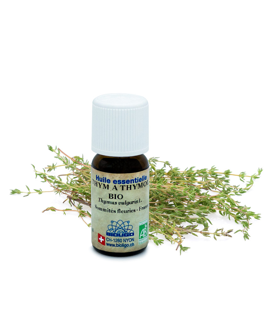 Principes actifs: Allergènes: Issu du grec θύμον qui signifie offrande ou parfum, de l’égyptien tham qui désignait une plante d’embaumement ou de la racine grecque thy qui signifie exhaler une odeur, son nom de thym est dérivé de thymus en latin. Les égyptiens l’utilisaient dans le processus d’embaumement, mais aussi comme condiment ou comme parfum. Associé à la légende de Pâris et d’Hélène, il naissait sous les larmes de celle-ci. Dans le langage des fleurs, il est symbole de courage, de créativité et d’amour durable. Sous-arbrisseau vivace d’environ 40cm de haut, le thym inclut plus de 300 espèces, la plus courante étant le thym à thymol. Plante rampante à petites fleurs roses ou blanches, à feuilles persistantes, il préfère les terrains pierreux et ensoleillés. Il fait partie des plantes aromatiques pour sa richesse en huiles essentielles. Aucune contre-indication connue à dosage physiologique. Liquide et vapeurs inflammables. Les huiles essentielles sont sensibles aux rayonnements UV ainsi qu’à l’évaporation progressive de leurs constituants. EN CAS D’INGESTION : appeler immédiatement un CENTRE ANTIPOISON ou un médecin. Nos produits